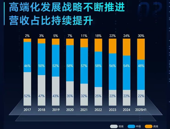 更值得关注的是,高端产品在公司营收占比中的快速提升。2025年上半年,公司高端产品营收占比已提升至30%,而在2024年同期,这一数字还仅为22%。这意味着在短短一年时间内,公司高端产品占比提升了8个百分点,充分证明了公司产品结构优化战略正在加速推进。